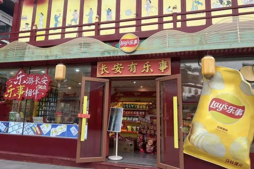 有的商铺采用中英双语标识,既体现国际化趋势,也方便游客识别;有的标识采用中英日韩四语并列,服务于多元游客群体;还有一些文化装置以创意语言吸睛,例如Lay’s主题店“长安有乐事”、自动售卖机上的趣味标语、文化墙上的“Hello”多语问候等,充分展现出城市空间中语言的文化象征功能。