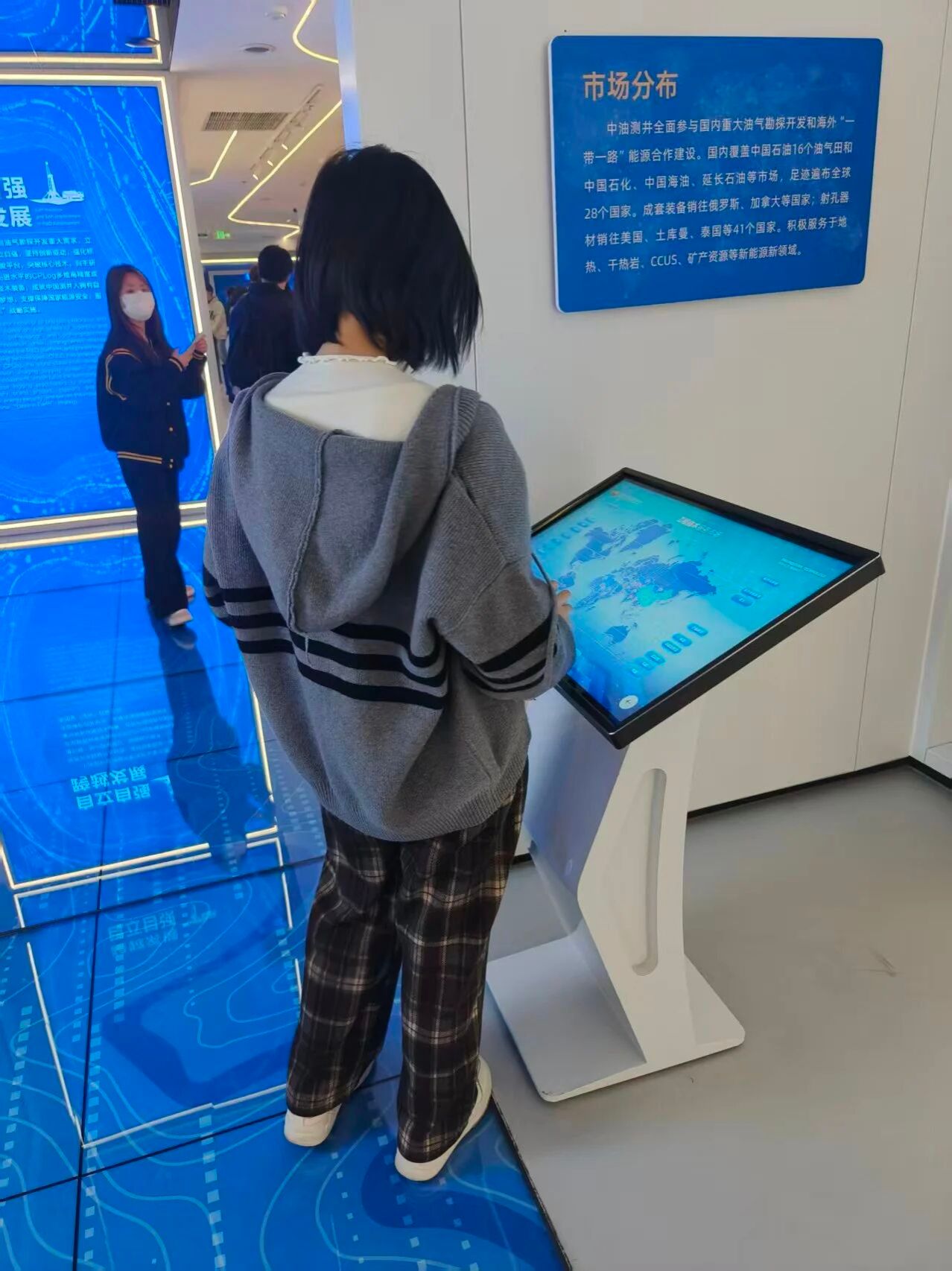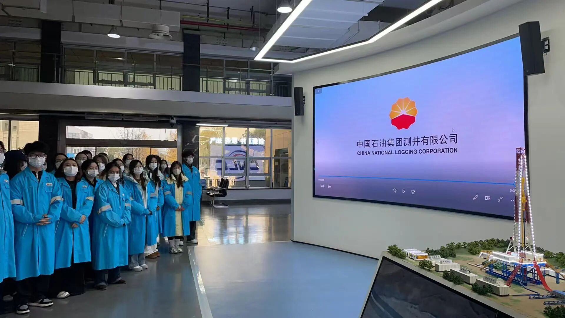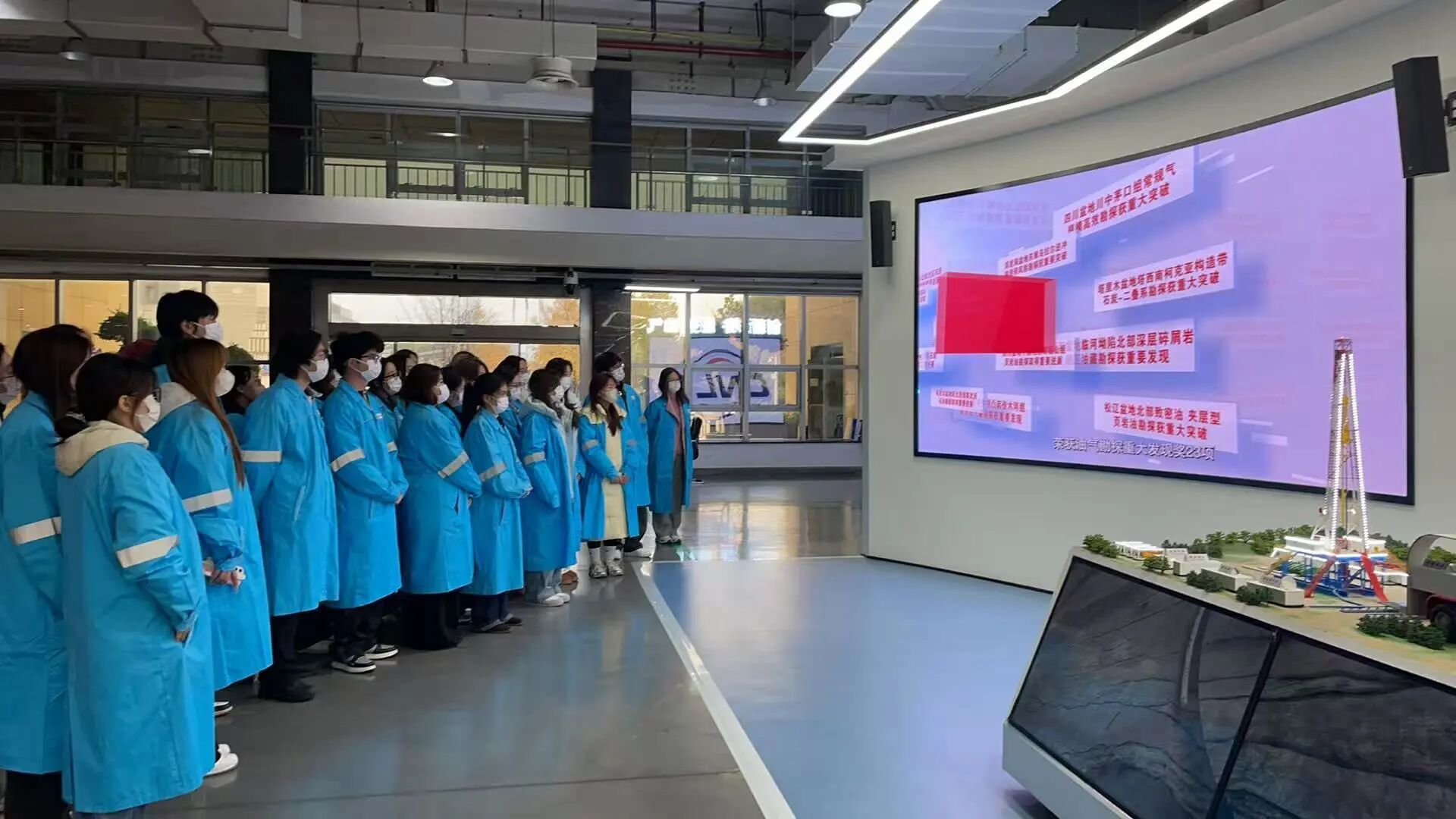 在公司技术人员的引导下,同学们依次有序参观了科技成果展示厅与部分作业支持区域。借助技术人员的生动讲解,结合丰富的实物陈列、动态模型与案例演示,同学们直观掌握了电法测井、声波测井、核磁共振测井等尖端技术的原理与实际应用——当了解到现代测井技术能像“医学CT扫描”般,精准透视数千米地下的地层结构,为石油勘探开发提供关键决策依据时,大家纷纷惊叹于科技对传统能源行业的赋能作用。而精密复杂的仪器设备、高度自动化的操作流程,更让同学们深刻感受到央企厚重的技术底蕴与持续的创新活力。