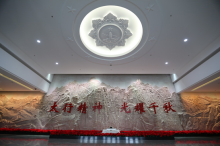 八路军抗战史陈列馆序厅,太行丰碑矗立在大厅中央,同时伴有歌曲《我们在太行山上》。大厅周围有三角形图案。大厅中央是褐色巨型立体“八”字。一尊八路军战士浮雕像镌刻着中国共产党所领导的八路军十四年抗战,打败日本侵略者的丰功伟绩。