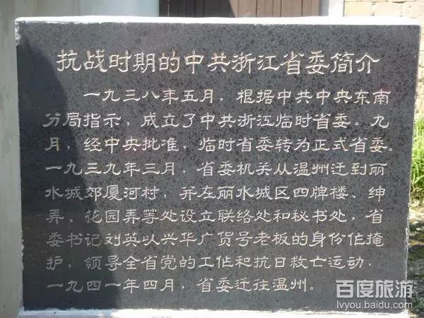 1939年至1941年间中共浙江省委在丽水城郊设了十余处秘密活动点,主要有:兴华广货号、黄景之律师事务所、刘英书记住所。
