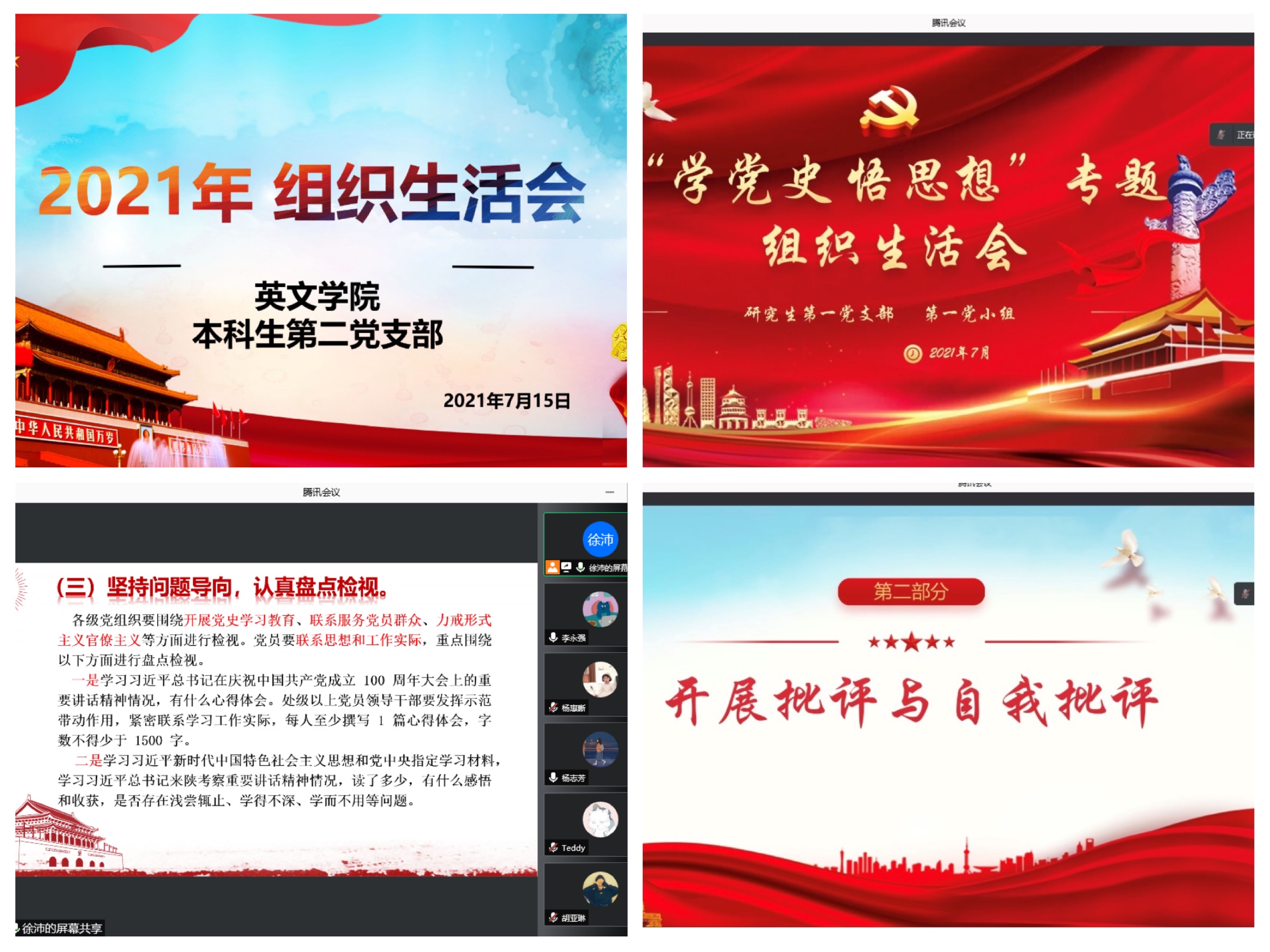 各学生党支部在反思自己理论学习不足的同时,结合英语专业,讨论了如何将专业知识、学生工作与党史学习有机结合,牢记初心使命,坚定理想信念,践行党的宗旨,在日后的学习和服务同学中发扬实干者精神,真正把党史学习教育成效转化为学习与工作的动力。
