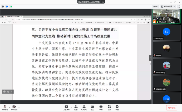 会上,单升军领学了习近平总书记在西藏考察时的重要讲话精神,学院党委副书记马文静领学了习近平总书记在河北承德考察时的重要讲话精神,党委统战委员雷茜领学了习近平总书记在中央民族工作会议上的重要讲话精神,副院长赵永刚领学了习近平总书记给“国际青年领袖对话”项目外籍青年代表的回信全文,副院长裴等华领学了习近平总书记在中央政治局第三十一次集体学习时的重要讲话精神。