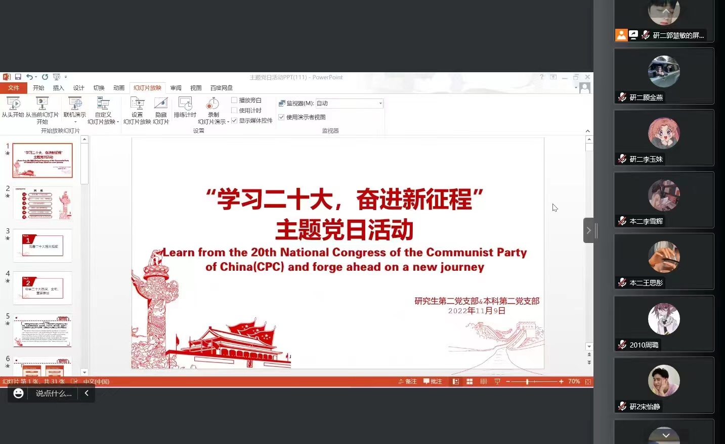 为深入学习宣传贯彻党的二十大精神,促进本硕党员之间专业学习交流,11月9日晚上,香香漫画 本科生第二党支部和研究生第二党支部通过腾讯会议,开展了以“学习二十大,奋进新征程”为主题的党日活动。两个支部全体党员参会,会议由研究生第二党支部书记郭慧敏主持。