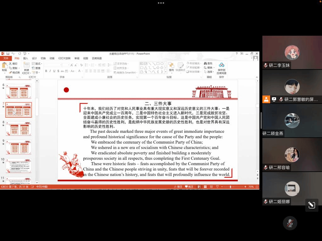首先,全体党员观看了视频《时政微记录-圣地温故再出发》。随后,党员郭子源、何亚楠、郭慧敏、李玉妹领学了党的二十大双语热词、金句以及重要表述。之后,党员代表戴鑫昱、张敏围绕学习内容进行了交流发言。接下来,研究生顾金燕分享了考研经验。
